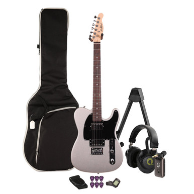 EastCoast T2 Dual Humbucker Electric Guitar Silent Bundle in Slick Silver with Headphone Amp & Accessories
