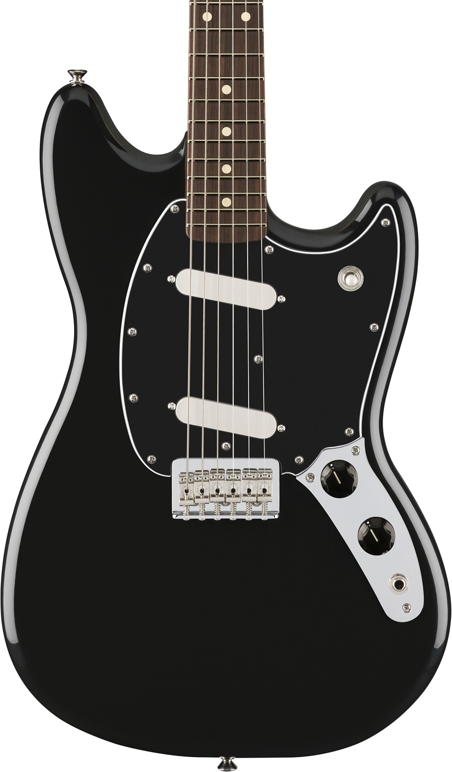 Black. Electric Guitars — Electric guitars have shaped modern music with their versatility, power, and endless creative potential. Using magnetic pickups to convert string vibrations into electrical signals, they allow players to explore a vast range of tones through amplifiers and effects. From the smooth blues of a hollow body to the roaring crunch of a solid-body rock machine, electric guitars adapt to every genre and playing style. With designs from iconic makers like Fender, Gibson, and PRS, they remain the driving force behind rock, metal, jazz, and pop. Whether performing live or recording in the studio, electric guitars continue to inspire innovation and self-expression for musicians everywhere.. Fingerboard. II. Mustang —