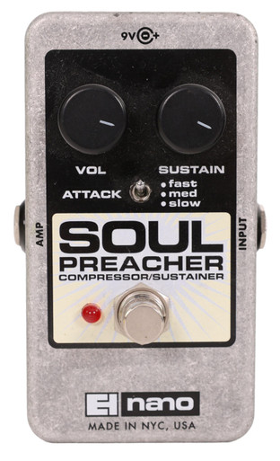 The Electro-Harmonix Nano Soul Preacher is an effect pedal that offers you 3 selectable attacks coupled with silky, long sustains that blend in perfect harmony to create one of the finest compressors ever built for guitar and bass. The variable attacks offer super articulate compression. Lets your guitar step forward without squeezing the life out of your tone.