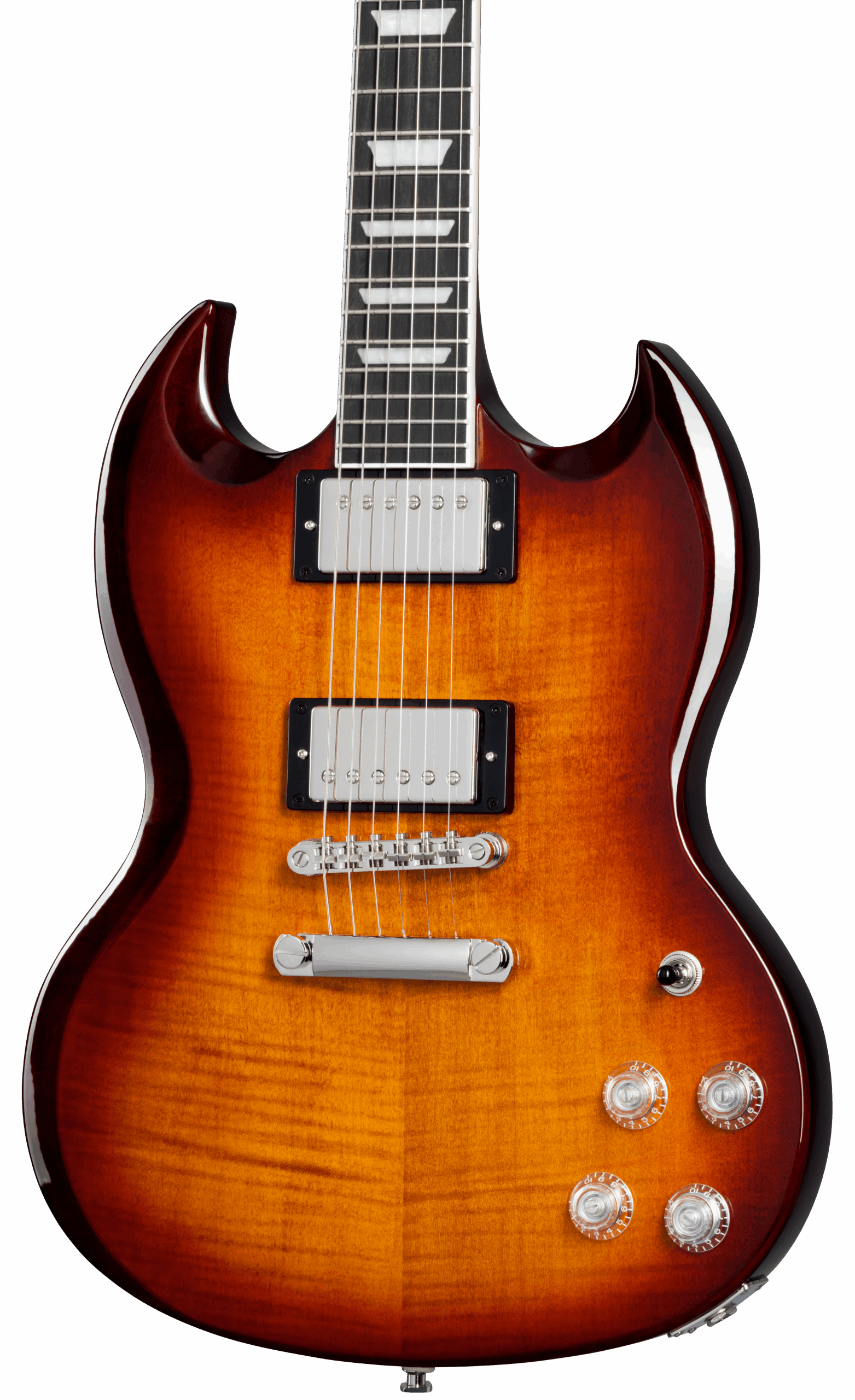 Burst. Electric Guitars — Electric guitars have shaped modern music with their versatility, power, and endless creative potential. Using magnetic pickups to convert string vibrations into electrical signals, they allow players to explore a vast range of tones through amplifiers and effects. From the smooth blues of a hollow body to the roaring crunch of a solid-body rock machine, electric guitars adapt to every genre and playing style. With designs from iconic makers like Fender, Gibson, and PRS, they remain the driving force behind rock, metal, jazz, and pop. Whether performing live or recording in the studio, electric guitars continue to inspire innovation and self-expression for musicians everywhere.. SG.
