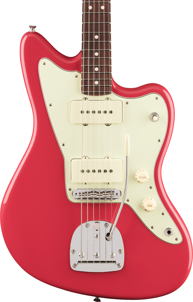 American. Classic. Dakota. Electric Guitars — Electric guitars have shaped modern music with their versatility, power, and endless creative potential. Using magnetic pickups to convert string vibrations into electrical signals, they allow players to explore a vast range of tones through amplifiers and effects. From the smooth blues of a hollow body to the roaring crunch of a solid-body rock machine, electric guitars adapt to every genre and playing style. With designs from iconic makers like Fender, Gibson, and PRS, they remain the driving force behind rock, metal, jazz, and pop. Whether performing live or recording in the studio, electric guitars continue to inspire innovation and self-expression for musicians everywhere.. Faded. in. Jazzmaster — The Fender Jazzmaster was designed in the late 1950s for jazz players but quickly found fame in surf, alternative, and indie rock. Its offset body offers great comfort when seated, while the unique floating tremolo and wide single-coil pickups create warm, chimey tones with plenty of character. The rhythm and lead circuit switching opens up a world of tonal options. Loved by players who like to stand out — from surf pioneers to shoegaze icons — the Jazzmaster is all about individuality and feel.. Professional. Red.