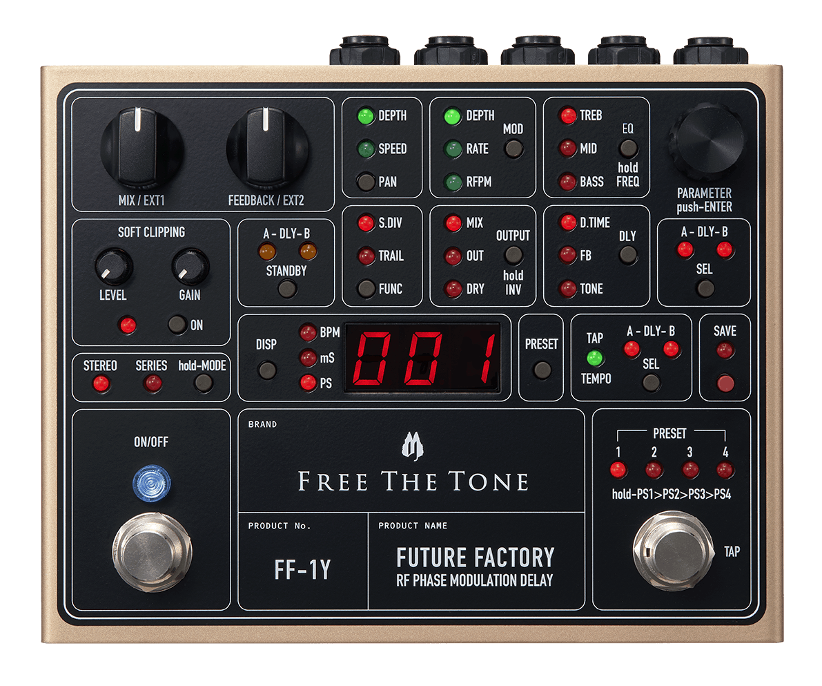 This unparalleled delay effect unit  Future Factory FF-1Y is the fruit of Free The Tone’s continuous pursuit of sound quality and new functionality, and the culmination of our latest creative endeavors. This delay unit will surely stimulate your imagination and inspire you to create new and original sounds.
