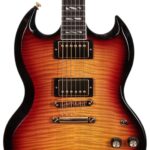 Gibson describe the SG Supreme as a hybrid SG and Les Paul. They’re not wrong, as it’s crafted with a pairing of Mahogany body and neck, as well as a AAA figured Maple top that looks simply stunning.