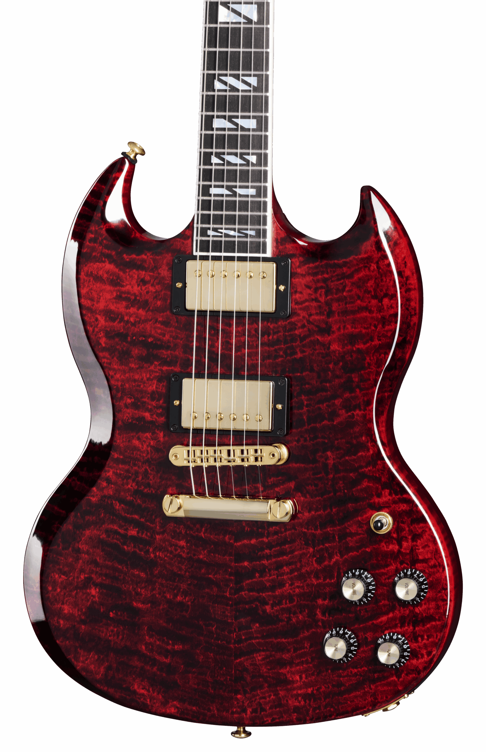 Electric — Electric guitars are all about versatility and expression, using pickups and amplification to create everything from clean chime to heavy distortion. Body types like solid, semi-hollow, and hollow each offer their own tonal character, while different pickup configurations such as single coils or humbuckers shape the sound further. A good electric guitar should feel balanced, stay in tune, and respond well to dynamics and effects. Whether you’re chasing classic rock tones, blues warmth, or modern high gain, the electric guitar is a powerful tool for creativity and individuality.. Electric Guitars. Guitar. in. Red. SG. Supreme. USA. Wine.