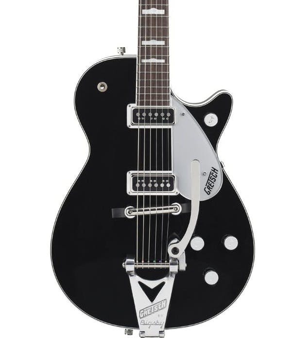 Gretsch celebrates the legacy of George Harrison with the G6128T-GH George Harrison SIGNATURE Duo Jet guitar, modeled on the instrument that the legendary guitarist often referred to as his “first real decent guitar.” Features include distinctive appointments and modifications found on Harrison’s original 1957 Gretsch Duo Jet, which he purchased secondhand in the very early 1960s. These include a lightweight mid-’50s-style chambered body, all-BLACK color scheme (arched maple top, mahogany back and sides, and back of the one-piece mahogany neck), Bigsby B3C tailpiece with a black Phillips head tremolo arm pivot bolt, and an offset strap button on lower bout. Other features include three-ply body binding (white-black-white), single-ply white neck and headstock binding, 22-fret rosewood fingerboard with 12″ radius and hump-block pearloid inlays, two single-coil DynaSonic pickups, vintage-style “rocking bar” bridge with rosewood base, silver plexi pickguard, chrome-plated Grover V98CM Sta-Tite tuners, Gretsch “G” arr