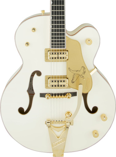 Authentically iconic, this striking guitar displays gold hardware-including the gold jeweled “G Arrow” knobs- gold sparkle bound neck, body and F Holes, vintage white gloss nitrocellulose lacquer finish and gold vintage thick plexi pickguard with Gretsch logo. With its stunning looks and huge sound, the iconic G6136T-59 Vintage Select Edition ’59 Falcon Hollow Body with Bigsby is the crown jewel of Gretsch guitars. Includes a deluxe hardshell case.