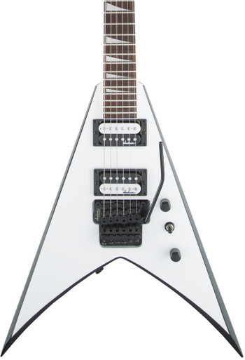 The regal JS32 King V has a basswood body, bolt-on maple speed neck with graphite reinforcement, compound-radius (12"-16") bound Amaranth fingerboard with 24 jumbo frets and pearloid sharkfin inlays, and bound headstock. Other features include dual high-output Jackson humbucking pickups with ceramic magnets and three-way toggle switching, Jackson-branded Floyd Rose double-locking tremolo bridge, black hardware and die-cast tuners. Available in Black with White Bevels and White with Black Bevels.