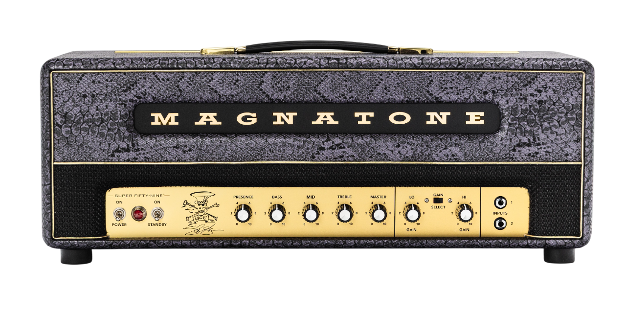 Guitars Pedals Amps & Stuff are in fine mood, we are now dropping the almighty Magnatone Slash Signature Super Fifty-Nine M-80 Head in Purple Python into your world. This is fresh in Guitar Amps and Cabs, new, boxed, and transmitted your way by courier. No planet too small, no riff too loud. This is brand new gear, full warranty. Want the full details? Click through to the Magnatone team direct, they have more details than we could ever be bothered to type out here. no one reads it Blaa Blaa Blaa, Go on, treat yourself. You deserve it. Magnatone Slash Signature Super Fifty-Nine M-80 Head in Purple Python