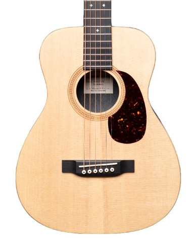 Compact style Travel Guitar with Solid Spruce top & Solid Mahogany Back and Sides plus Branded Gigbag. This steel string guitar is built to withstand the rigors of outdoor use and travel. Weighing less than 2.5 lbs, the model has a rich and loud tone and includes a padded black nylon carrying bag and a Martin woven strap.