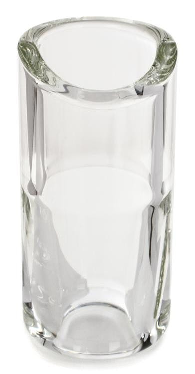 Clear Glass Rock Slides are individually hand moulded in the USA by master lampworkers. These have all the same features as our brass Rock Slides® with the Knuckle Cut, Finger Rest and Tapered Interior. These fit almost exactly like their brass counterpart but are slightly longer. The main difference being that they are much lighter & faster so you can really cook with these on an electric guitar. Because of our unique tapered interior design they do have enough mass to light up your acoustic.