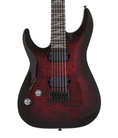 The body of the Omen Elite is made from mahogany and is paired with an eye-catching Burl top that really complements the Black Cherry Burst finish. The maple neck on the Omen Elite is designed to be played fast. The satin finish and Thin C shape lets your hand glide up and down the neck with ease. The rosewood fingerboard offers a smooth yet natural-feeling playing surface and the 14” radius is perfect for playing fast solo lines.