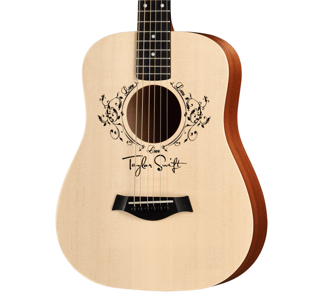 Inspired by memories of writing songs on her own Baby Taylor, Taylor Swift collaborated with Taylor Guitars to design the Taylor Swift Baby Taylor (TSBT). Based on our compact 3/4-scale Dreadnought, the TSBT is crafted from a resilient sapele laminate body with a solid Sitka spruce top. Swift’s custom, screen-printed rosette design features the word “Love” three times among a delicate vine motif. The personalized design also features her signature above the bridge. With a slim 1 11/16-inch neck and a compact shape, the guitar is just right for a young player’s hands and anyone who likes to pick up and play on the go. The TSBT is available at the same price point as the standard Baby Taylor, and comes with a gig bag.